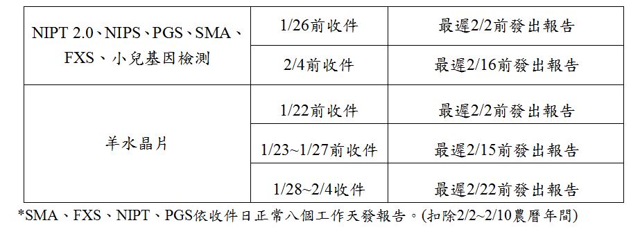 農曆春節2019年2月4日(除夕)星期一~ 2月9日(初五)星期六 ,檢體收件及報告完成日期變動如下: