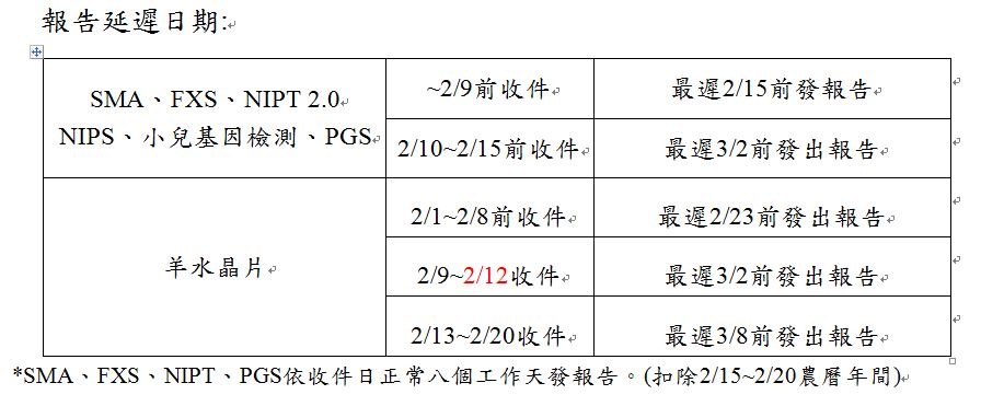 農曆春節2018年2月15日(除夕)星期四~2月19日(初四)星期一,檢體收件及報告完成日期變動如下: