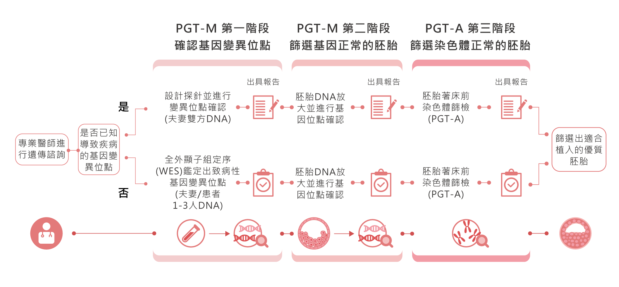 「胚胎著床前單基因疾病篩檢」 (Preimplantation Genetic Testing for Monogenic/Single gene Disorder ; PGT–M),以往稱為胚胎著床前基因診斷(PGD),是配合試管嬰兒的療程,在胚胎移植前,為胚胎進行單基因遺傳疾病的基因變異篩檢。PGT–M能協助診斷因父母單方或雙方同時帶有特定基因異常的疾病,避免將嚴重的基因異常遺傳至下一代,同時亦可避免因需要終止妊娠所帶來對身體及心靈上的創傷。