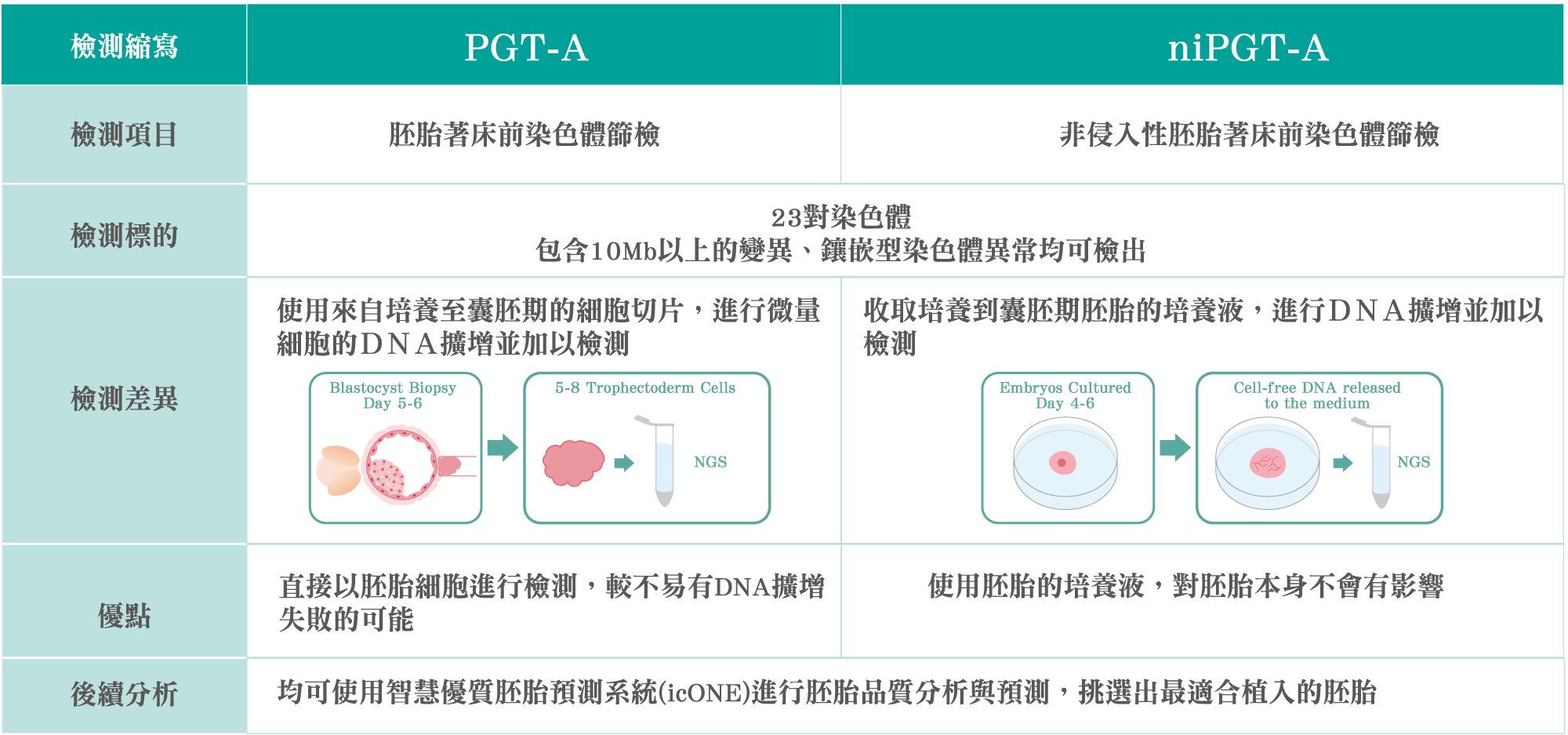 上述PGT-A檢測是使用培養至囊胚期的胚胎細胞切片送檢,而目前最新的檢測方式為非侵入性胚胎著床前染色體篩(Noninvasive Preimplantation Genetic Testing for Aneuploidy, niPGT-A),是收取培養到囊胚期胚胎的培養液,透過分析培養液中胚胎游離的DNA來進行NGS分析,其檢測準確率亦高達9成以上。