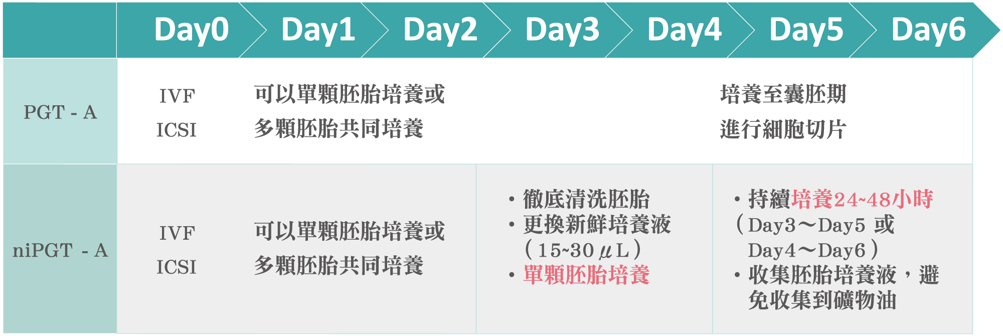 進行試管嬰兒療程後,待胚胎發育到第5天(囊胚期)即可進行胚胎切片,將切下來的一小部分胚胎細胞進行DNA擴增,接著進行全基因組定序分析,即可以得知胚胎染色體的結果,選擇染色體正常的胚胎進行胚胎植入。