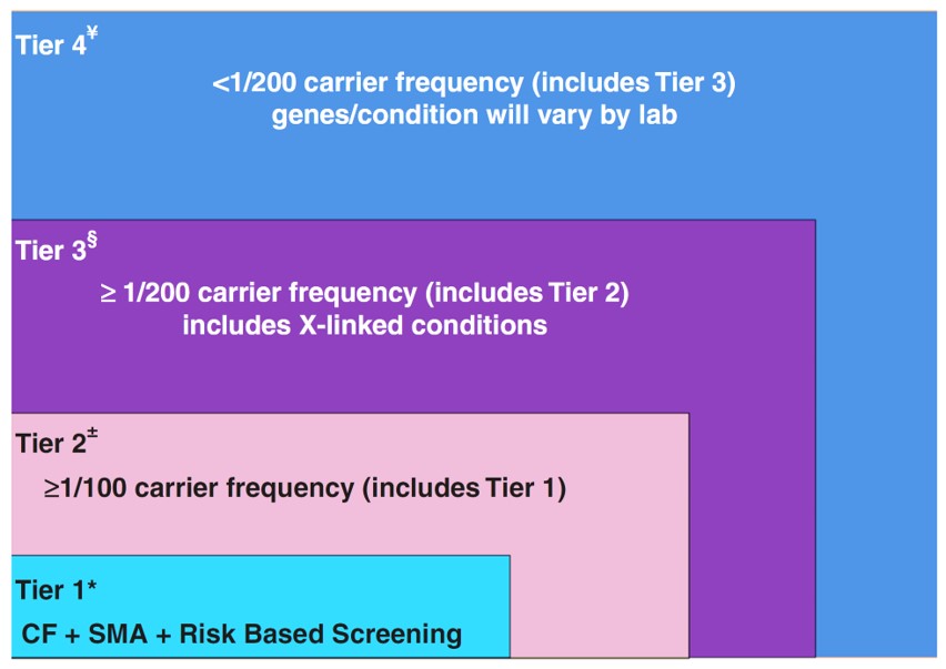 擴展性帶因者篩檢(ECS)之國際醫學學會指引 ACMG1之建議,帶因者篩檢應涵蓋以下三階層:
